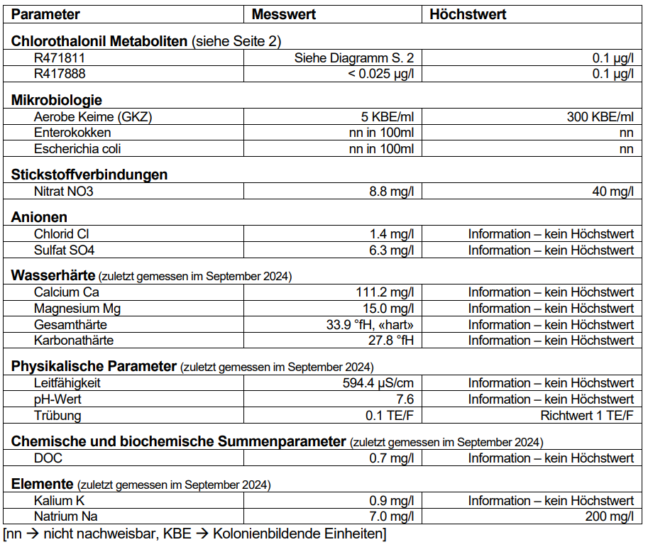 Die untersuchten Proben erfüllen im Rahmen der durchgeführten Untersuchungen die Anforderungen der Verordnung des EDI über Trinkwasser sowie Wasser in öffentlich zugänglichen Bädern und Duschanlagen (TBDV) vom 16. Dezember 2016 in der aktuellen Version (vgl. betreffend Chlorothalonil Metaboliten Diagramm und Ausführungen auf Seite 2).